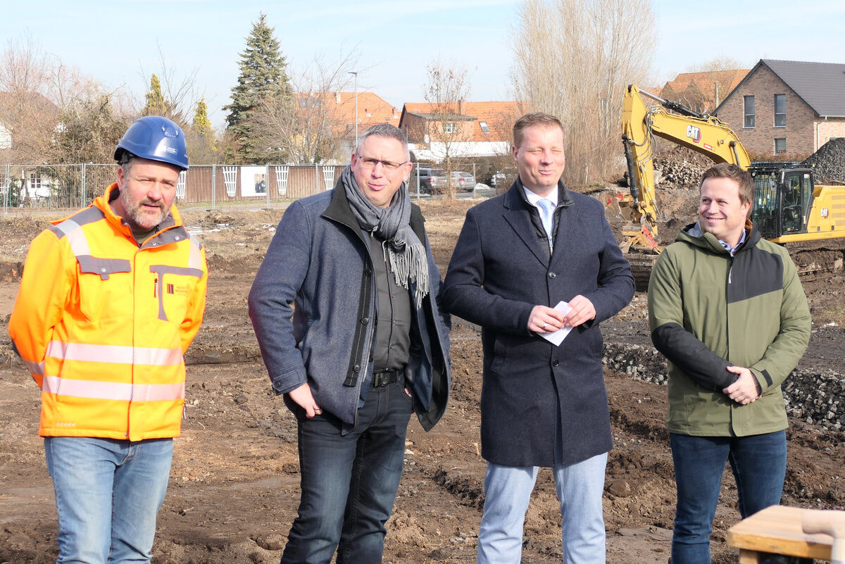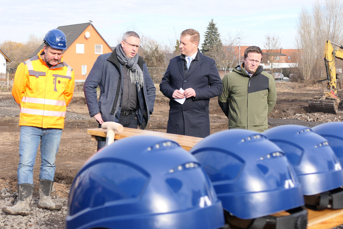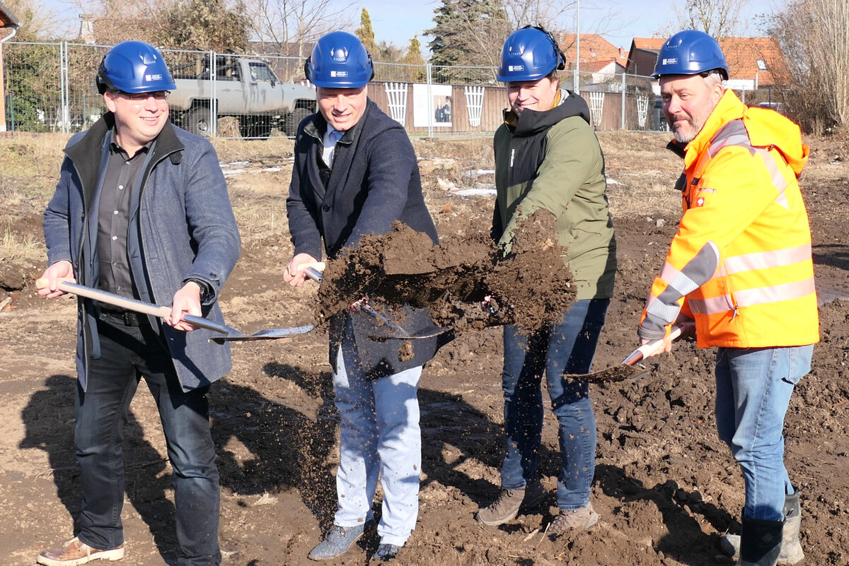 Nach diesen Worten schritten der Geschäftsführer und der Bürgermeister gemeinsam mit den Geschäftsführern der Herbst Plan-Consult GmbH, Bastian Herbst, sowie der Hoch- und Tief-Brückenbau Bernburg GmbH, Falk Hüttl, zum symbolischen Spatenstich in die „Baugrube“.