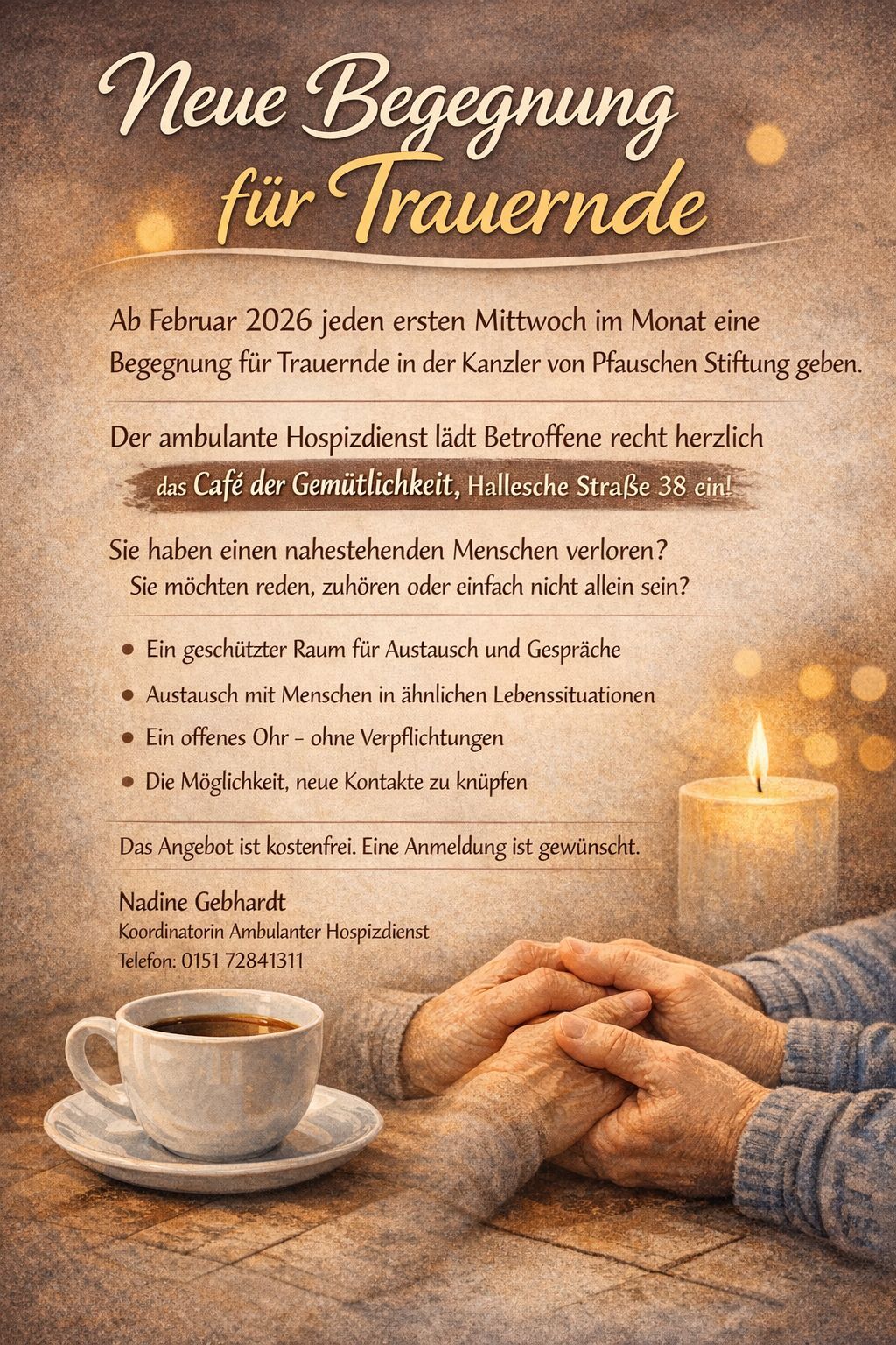 Der ambulante Hospizdienst lädt Betroffene recht herzlich in das Café der Gemütlichkeit; Hallesche Straße 38 ein!