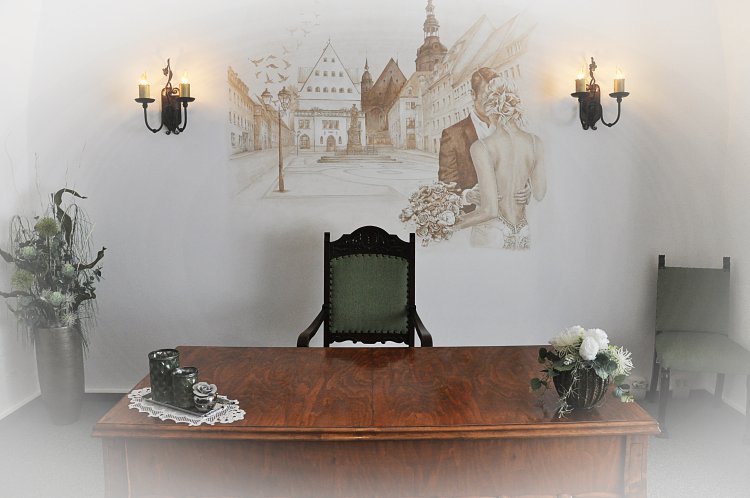 Im Rathaus der Lutherstadt erwartet Sie ein festlich gestalteter Raum mit Platz für bis zu 30 Gäste. Ein 2020 geschaffenes Wandbild des Eislebener Künstlers Mario Rübsam verleiht ihm eine besondere Tiefe – prachtvoll und zugleich feinfühlig, so wie der Moment, in dem zwei Menschen zueinander „Ja“ sagen.